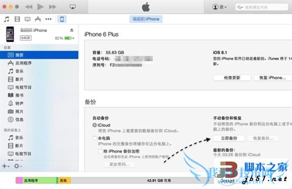 5、随后请在iPhone的管理摘要界面中,点击“立即备份”按钮,根据个人的需要来选择备份手机上的数据。