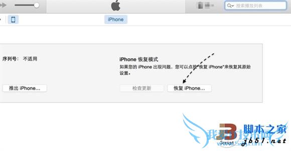 8、随后请点击iTunes窗口里的“恢复iPhone”按钮,如下图所示。