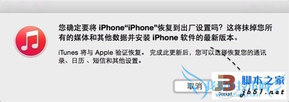 9、接着iTunes会连接苹果的更新服务器,检测当前最新的iOS手机系统,并提示我们是否要删除手机上的所有数据并恢复,点击“恢复并更新”按钮继续。