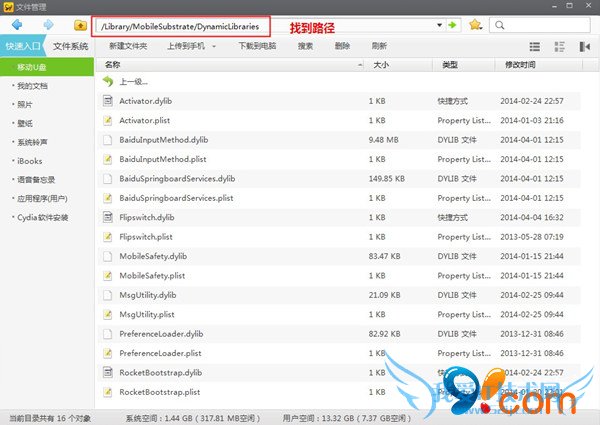 3.打开91助手文件管理,找到路径/Library/MobileSubstrate/DynamicLibraries,将下载好的文件解压缩,放入该路径。