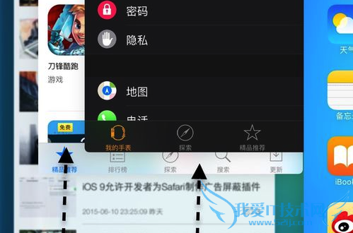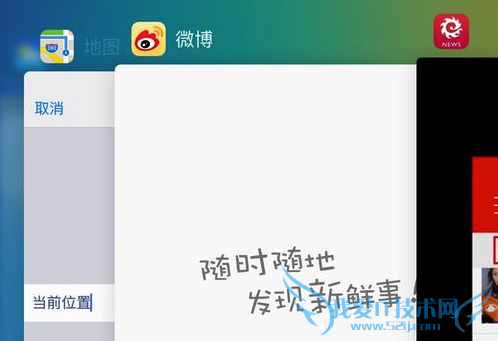 2、接下来就可以看到后台多任务管理了,与之前的 iOS7 和 iOS8 不同的是,应用程序的图标从底部调整到了顶部。当然也可以通过左右滑动来查看在后台中不同的应用程序。
