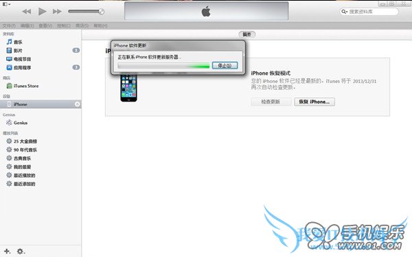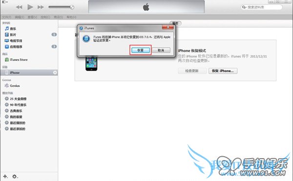 6.出现提示弹窗“iTunes会将iPhone更新到iOS 7.0.4,并与Apple 验证此更新”,点击【恢复】按钮