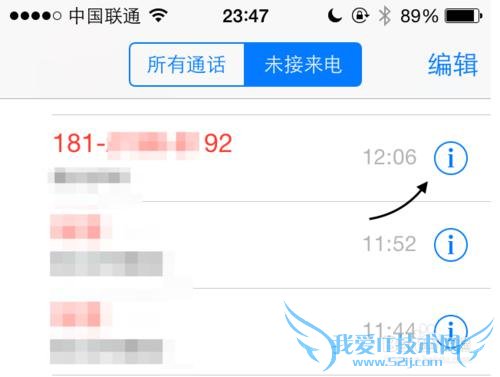 2、这里以未接电话中的号码为例,点击号码右侧的“叹号”图标,如图所示