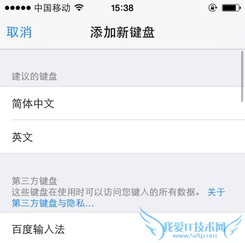 iOS 8系统专门为第三方输入法开辟了专门的区域,比如我们还要添加百度输入法,只需要点击百度输入法即可完成添加。成功添加之后,我们就可以通过iPhone键盘上的小地球标志切换到第三方输入法。