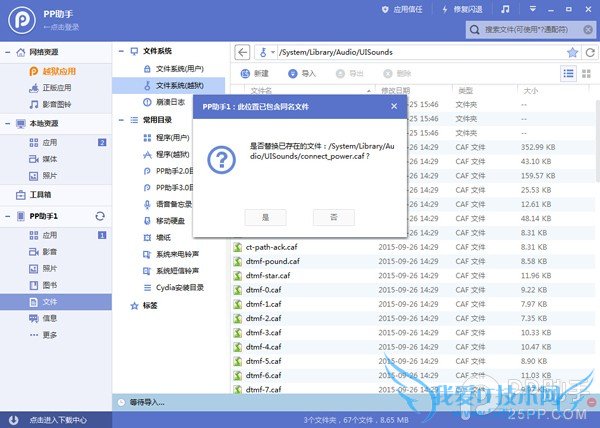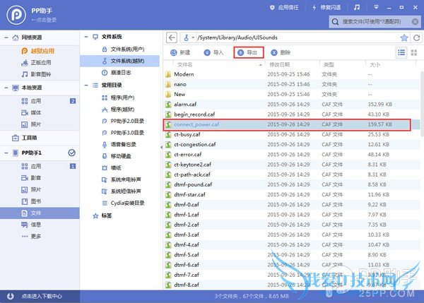 3、设备连接PP助手,在文件系统(越狱)中找到路径【/System/Library/Audio/UISounds】,建议先备份iPhone充电提示音源文件【connect power.caf】