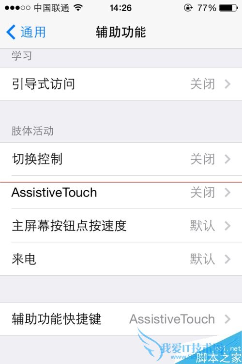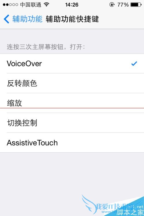 5、我们开可以使用设置里面的另一个功能来快捷打开这个语音播报(VoiceOver)的功能可以随时关闭和打开方法如下,设置=》通用=》辅助功能=》最下面的“辅助功能快捷键(VoiceOver)”