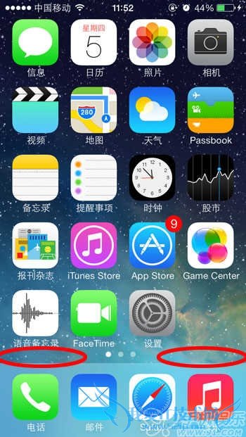 第三种翻页的方法就是在底部图标栏和桌面壁纸的交界处两侧。
