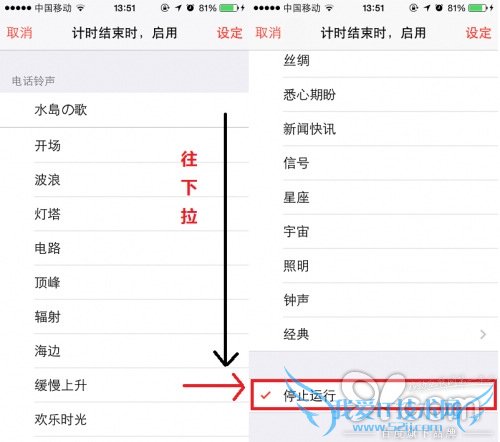 接着就会看到选取计时铃声的画面,这时候只要往下拉到底,选择「停止播放」。接下来只要设定好时间,就会在倒数计时完毕后自动将音乐停止并让手机关闭屏幕喔!