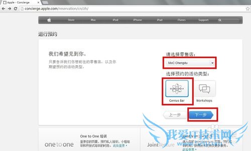 在预约页面选择你所在区域的零售店“Mixc Chengdu(成都, 成都万象城店),预约的活动类型选择Genius Bar(天才吧)。选择完成后点击按钮“下一步”。