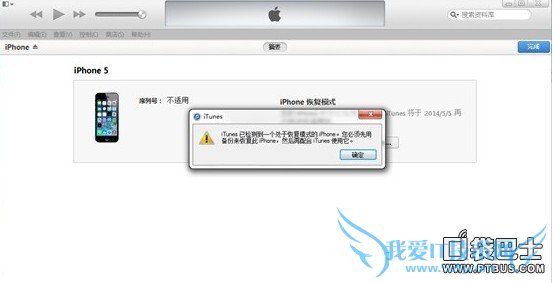 2、iTunes会自动检测到一台等待恢复的设备,点击确定;