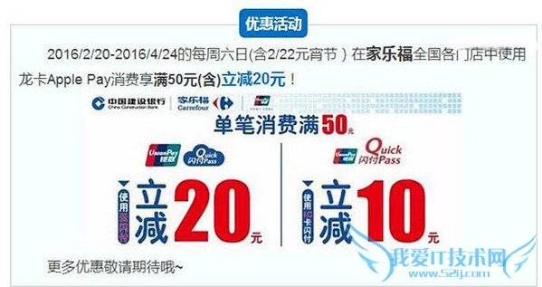 2016年2月20日至4月24日期间的每周六日(含2/22元宵节)在家乐福全国各门店中使用龙卡Apple Pay进行消费,可享满50元(含)立减20元的优惠。