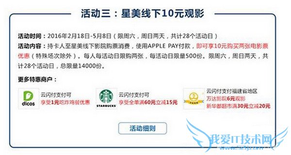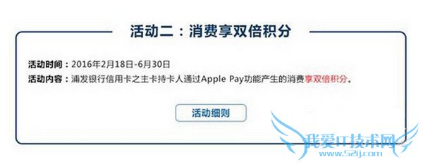 绑定浦发银行信用卡并激活且完成首笔支付交易,即可获得500MB手机流量(仅限前20万名用户);使用Apple Pay支付交易笔数达到15笔且商户至少2家,有机会赢取美国西海岸12日之旅,共15个名额;通过Apple Pay支付即享双倍积分;免费抽奖机会,首次激活Apple Pay有1次抽奖机会,每月消费金额达100元或交易笔数达3笔,即有第2次免费抽奖机会(2016.6.30截止);到星美影院使用Apple Pay支付可享10元购买2张电影票(每日限量500份)。