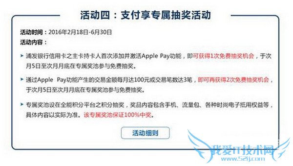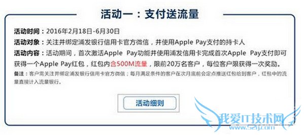 2016年2月18日至3月31日,客户在Apple Pay添加我行卡(含信用卡,借记卡),即有机会赢取500MB手机上网流量。4月初,我行将统一组织抽奖,抽取1000位成功绑卡的客户,各奖励500MB手机上网流量。