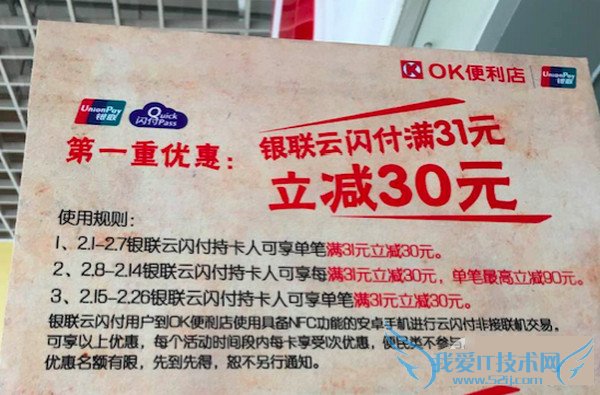 2.15-2.26银联云闪付持卡人可享单笔满31元立减30元。