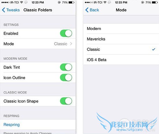 当你开启现代风格的时候,还可以打开“Icon Outline”和“Dark Tint”的选项,这可以使得文件夹背景颜色深化。另一方面,如果你选择经典模式的话,你就可以开启“Classic Icon Shape”来为文件夹图标增加更厚的边缘,就像 iOS6 一样。