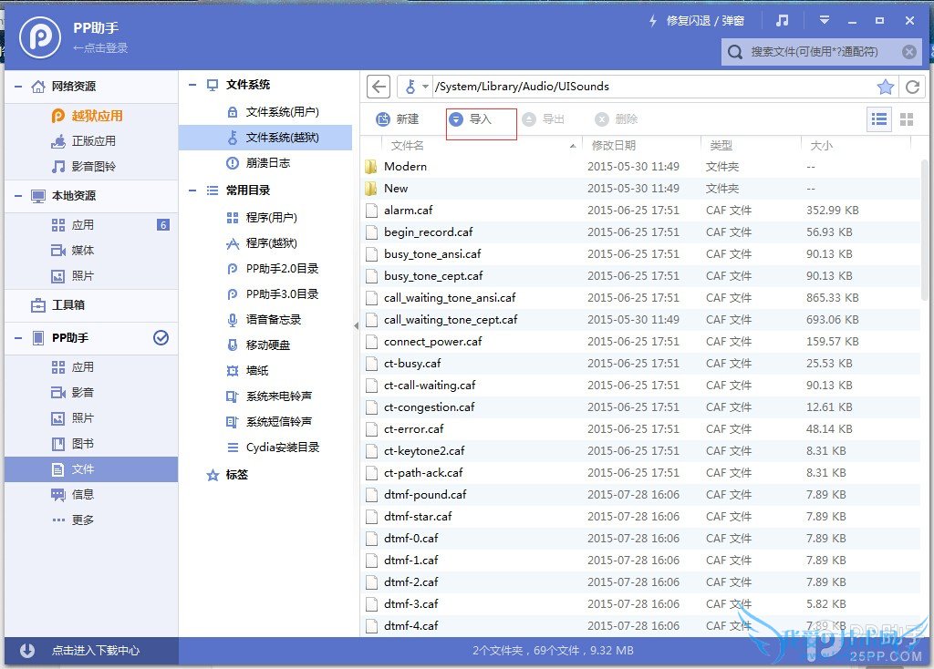 3.打开PP助手电脑版,依次进入【文件】-【越狱系统文件】,打开路径:System/Library/Audio/UISounds,{先备份原有的拨号单}