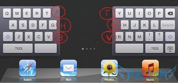 你肯定知道两手往外一扒,可以把iPad上的键盘扒成两半,可是你知道扒开的键的空位仍有些地方可以输入的么?如上图,有时候要输入这些字母但习惯了在T右边找Y是没有问题的。