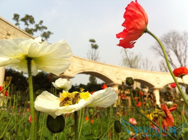 这张照片里面就没有明显的横竖线条可以让我们来参考。包括蜜蜂所在的那朵花的枝条都是不直的。但是我们在拍的时候仍然可以找到水平。在哪儿呢? 就在我们构图中。我们在构图的时候尽量让重点表现的那个点处于我们认为水平的位置上。比如蜜蜂所在的那朵花的花枝虽然不直,但仍然可以拿来利用;那朵花的 花瓣虽然也没有水平线,但我们观察会发现花瓣的两端仍然可以找到水平的平面。这样的话,我们的主体就处于水平的状态栏。然后再将画面进行一些微调,来满足 其他的物体,尽量让画面往主体那边靠。