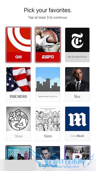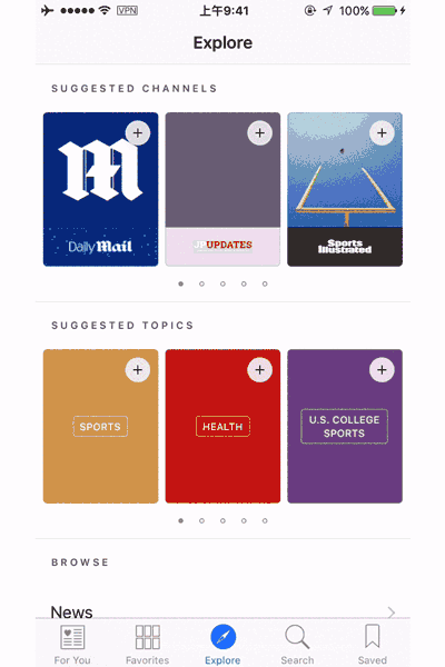 进入 News 新闻应用界面后,可以选择自己感兴趣的媒体以及话题,至少选择3个以上,完成选择后 News 应用会自动生成文章列表。News 应用的设计很类似音乐应用与 App Store 的合体,底部的几个功能包括“为您甄选”、最喜欢的、探索、搜索和保存。在为您甄选中,是 News 自动根据我们选择的新闻源生成的文章,在 Favorites 中可以查看自己选择的新闻源。探索中,可以查看更多新闻源并加入收藏,搜索和保存功能就不用多介绍了。
