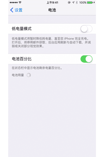 当 iPhone 电量降至20%和10%时,系统会弹出窗口,用户可以选择激活低电量模式,我们也可以定位到设置——电池界面,手动开启低电量模式。开启低电量模式后,右上角的电池图标会变成黄色。在低电量模式开启之后,iPhone 将停用邮件获取、后台应用刷新与自动下载,并减弱或关闭视觉效果。
