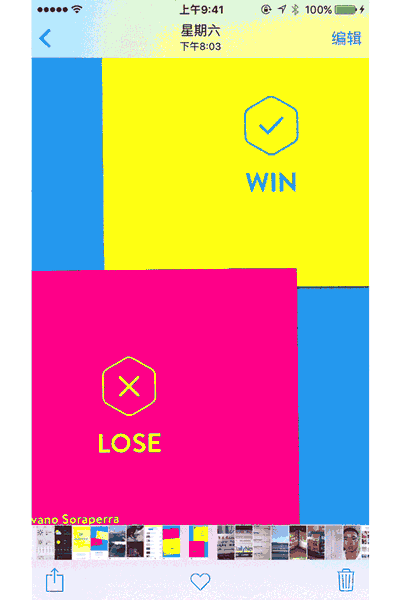 点击任意照片后,我们可以看到照片底部多出了一条导航栏。仔细看这些全是周围照片的缩率图,这就是 iOS 9 的新功能之一,快速导航和浏览。利用这项功能,我们可以在查看单张照片时快速在附近的照片之间切换,也可以快速滑动,让照片切换速度大大增加。在照片导航栏中,当前显示的照片左右两侧会有空白的线条。