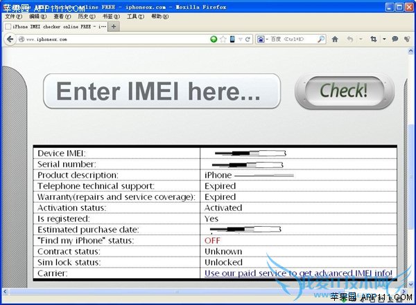 第二步,打开iphoneox.com网站,输入设备的IMEI,即可显示出设备的相关信息,倒数第二行就是是否有锁了。