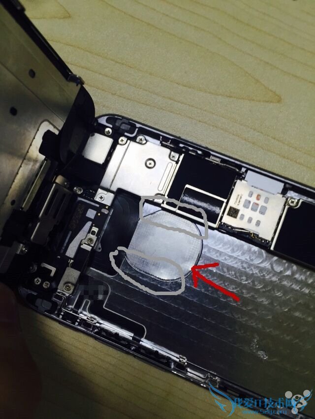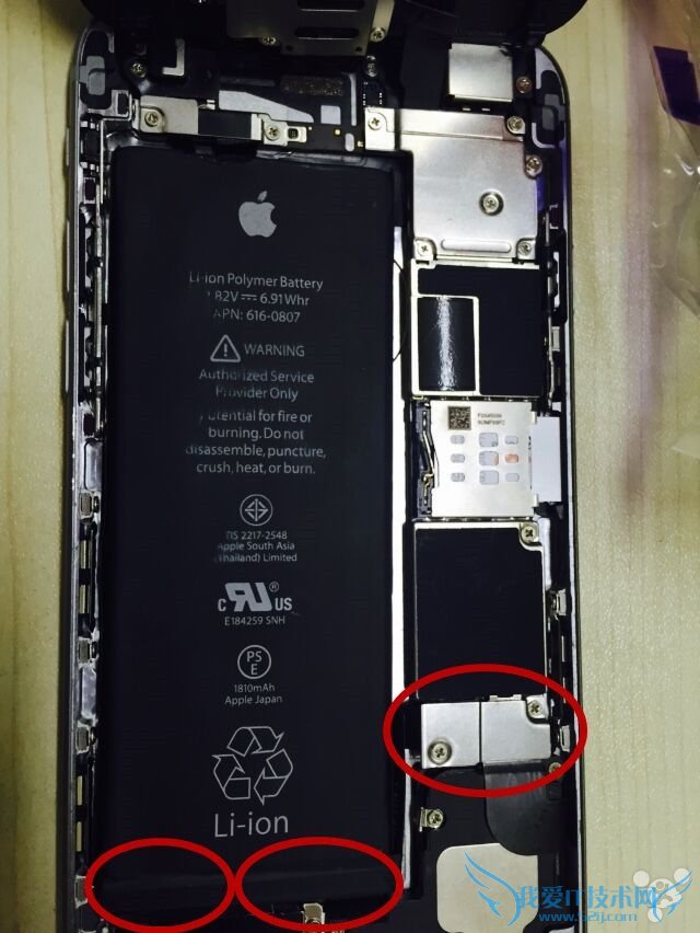 第三步:拆卸电池(电池上面我圈的两个圈圈原来应该是两个长方形的3M无痕粘胶,扣下来,然后从电池旁边两侧抽出 即可,不要暴力拆卸电池!有可能会起火。。。实在不懂电池拆卸的请百度。。-------然后把另外一个圈起来的地方 螺丝拧掉 ,把那个盖拿下来,把电池排线连接扣开,取下电池。
