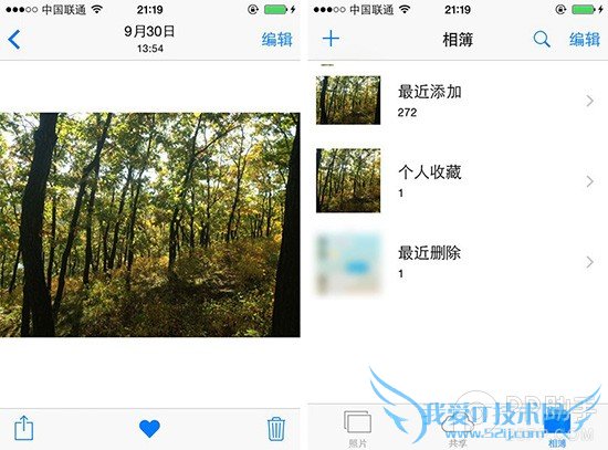 进入“最近添加”界面时,可以查看正常的网格布局照片,所有照片都以小方块的形式显示出来。点击查看任意照片的详情,除了顶部的拍摄时间,右上角的编辑功能外,下方的3个功能分别是分享、收藏和删除。分享功能可以将照片分享至集成在系统中的社交网络中,而删除功能可以将照片转移至“最近删除”相册。照片浏览时,可以看见下方的心形图标,默认是空心的图标。轻按空心后,空心会转变为实心。这张照片也会被加入“个人收藏”。如果是第一张被收藏的照片,iOS8 照片应用会创建“个人收藏”相册。