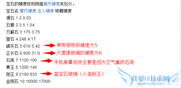 在这里我们要说明一下莫氏硬度的问题,在硬度排名中,硬度高的物体可以轻易在硬度低的物体上留下痕迹,而硬度低的物体则很难划伤硬度高的物体,从图中我们可以看出,为什么明明手机屏幕用的大猩猩玻璃可以不惧钥匙而却会被空气中的沙子划伤。