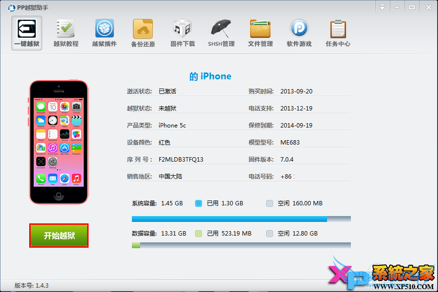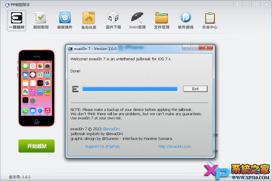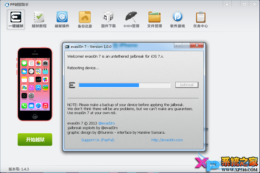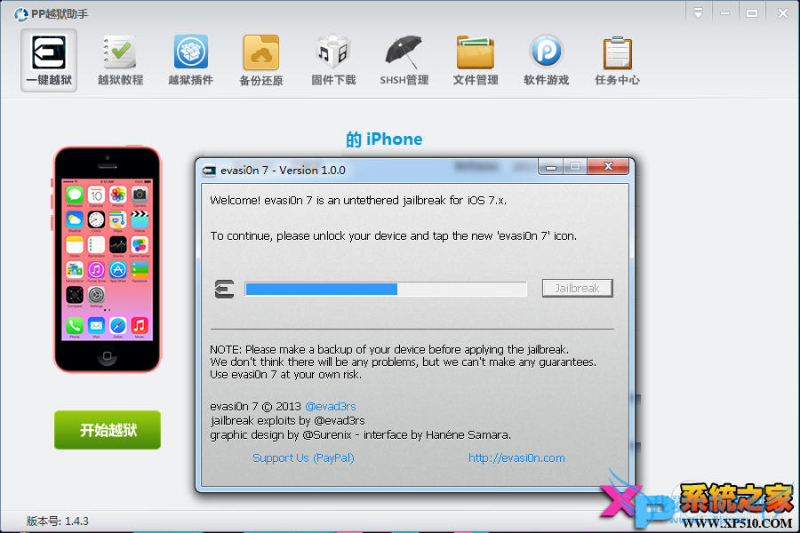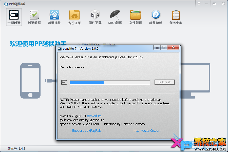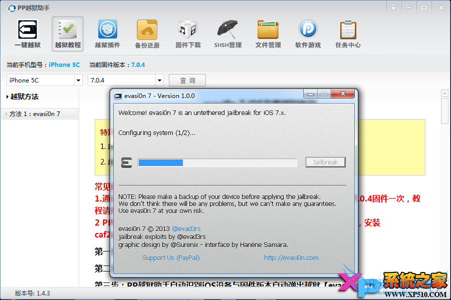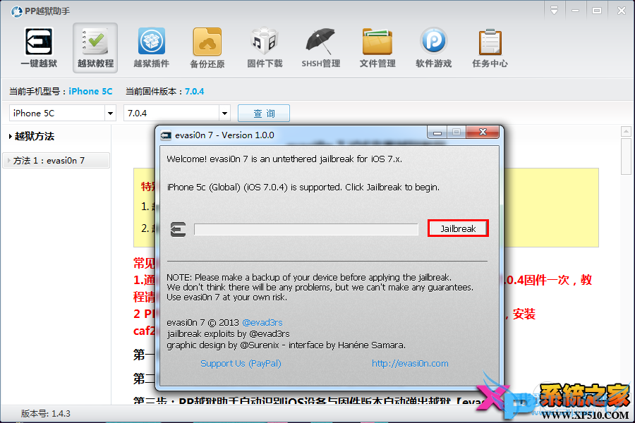 第三步:PP越狱助手自动识别iOS设备与固件版本自动弹出越狱【evasi0n 7】工具