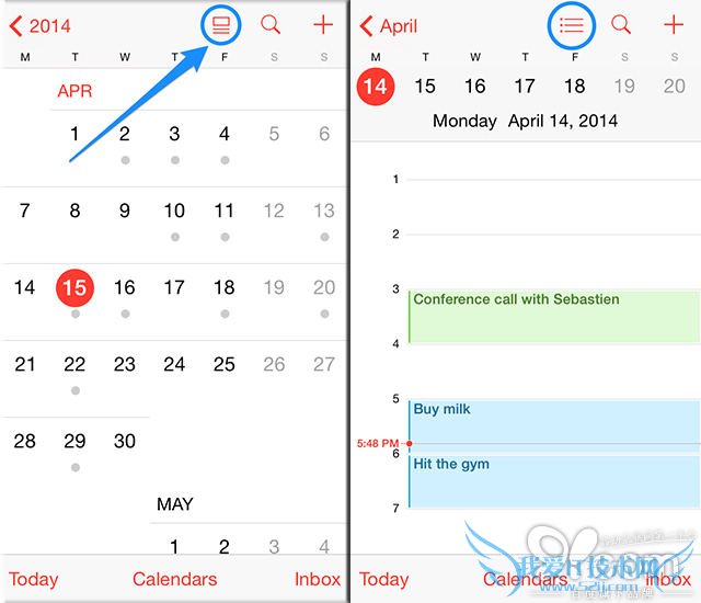 如何在iPhone的日历应用程序里切换显示为列表视图?(需要iOS 7.1以上)