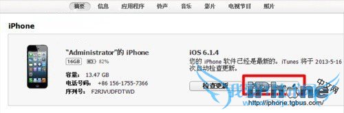 另外,iPhone手机恢复出厂设置还可以借助iTunes工具,具体方法是,将iPhone收集连接电脑,然后打开iTunes工具,之后选择【恢复iPhone】即可,如下图所示。