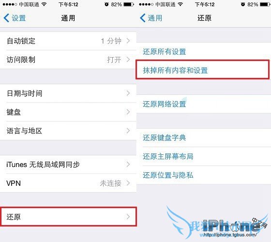 第二步:进入iPhone【通用】设置后,再进入【还原】设置,在还原设置中点击进入【还原所有设置】或者【抹掉所有内容和设置】设置,如下图所示。