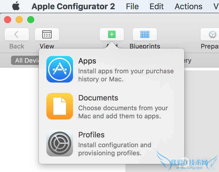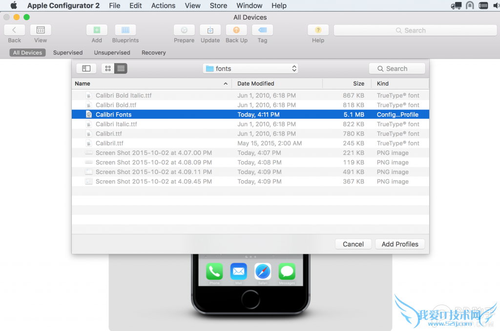 第四步:关闭刚才的窗口回到"apple configurator 2"主界面“All device”。把设备iphone/ipad连上数据线,并保持在不要锁屏的状态。在工具栏上选“add profiles”。