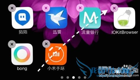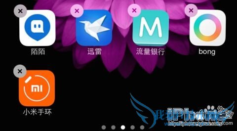 2、接下来可以看到屏幕上的应用图标会抖动,并且在左上角会出现一个小 x 按钮,点击即可删除该应用软件所占用的内存空间,当然该软件也同时会被从手机上删除掉。