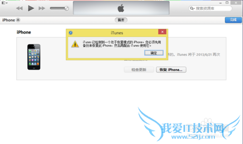 ¡¡¡¡È»ºóÎÒÃÇ´ò¿ªµçÄÔÉ쵀 iTunes£¬½ÓÏÂÀ´Èí¼þ»áÌáʾÎÒÃÇÒѼì²âµ½Ò»¸ö´¦ÓÚ»Ö¸´Ä£Ê½µÄ iPhone£¬µã»÷¡°È·¶¨¡±°´Å¥¼ÌÐø£¬ÈçͼËùʾ