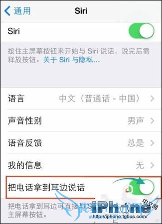 2、在Siri的设置项中,开启“把电话拿到耳边说话”选项功能。