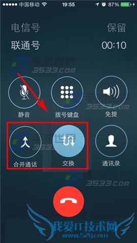先拨通一位联系人的号码,接通后点击【添加通话】按钮,进入【联系人】界面选择另外一名【联系人】,接着你可以选择【合并通话】或者【交换】来实现三方通话。(注:合并通话三方都会进入同一通话,交换即一方被呼叫等待)(如下图)