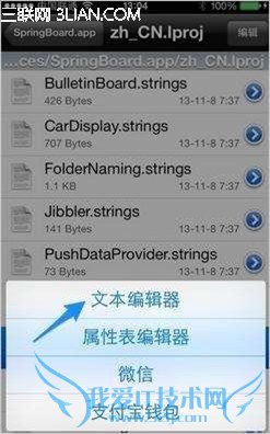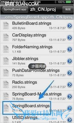 回到了系统的根目录下,我们依次进入 /System/Library/CoreServices/SpringBoard.app/zh_CN.lproj 下,找到 zh_CN.lproj 目录下的 SpringBoard.strings.plist 文件:
