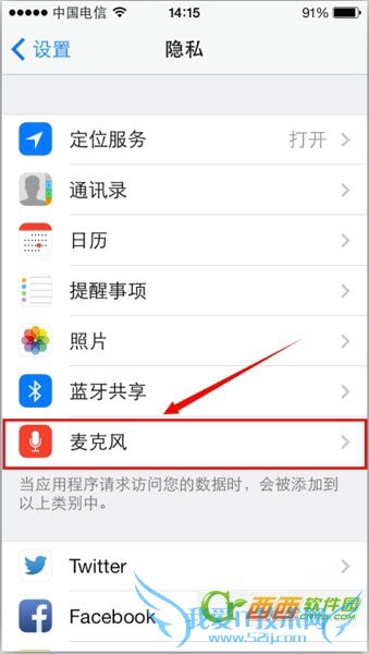 3)进入“隐私”之后,我们可以看到“麦克风”的选项,点击点入“麦克风”。(如下图所示)