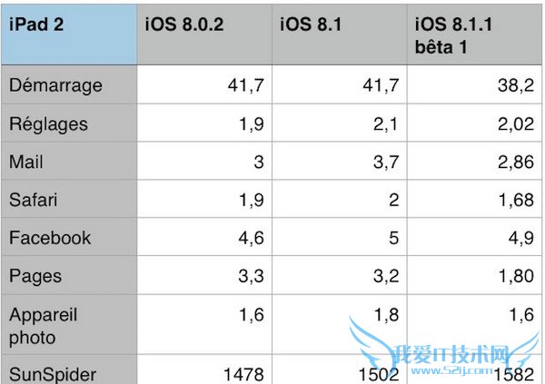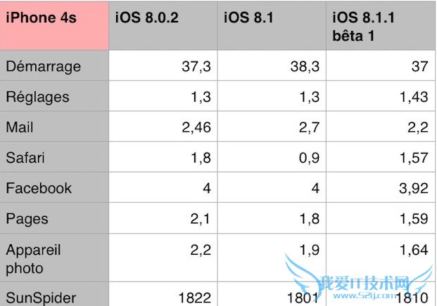 同时,法国网站 iGen.fr 也对 iPhone 4s 和 iPad 2 进行了 iOS 8.0.2, iOS 8.1, iOS 8.1.1 的对比测评, 结果如下, Démarrage 是开机的意思, Réglages 是系统设置, Appareil photo 是拍照. 数字单位都是秒。