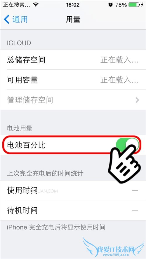 点击“用量”,往下滑动,如图,找到“电池百分比”,用手指点击将其打开,这时打开状态显示为绿色: