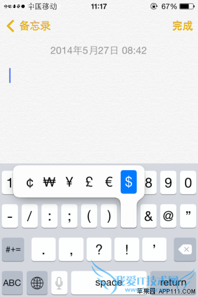 第二步,若想输入其它国家货币符号时,长按美元符号可以调出类似的货币符号,如欧元、人民币、英镑等,再将手指移至需要输入的货币符号,即可输入。