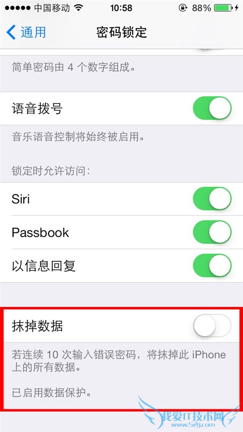 第7步:密码设置完毕后立即生效,用记在该设置中还可以关闭密码、更改密码。还可以设置锁定时允许访问的程序,甚至还有一招更狠的:抹掉数据!用户输入密码十次后,系统将抹掉该手机中的数据。对于手机遗失,该功能不失为避免数据被窃的最佳方案 ;