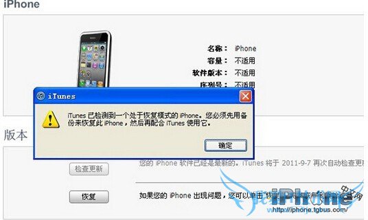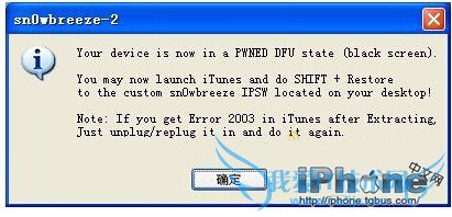 如果成功进入了DFU模式,会弹出如下页面。这时候不要去点击确定,马上打开iTunes准备刷自定义固件,点击确定会导致刷自定义固件失败。