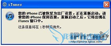 自定义固件刷成功后,会有如下提示,这说明你的iPhone恢复到了5.1.1固件了,并且已经越狱成功(选用保留基带模式的用户并不会越狱,还需要重新越狱)。