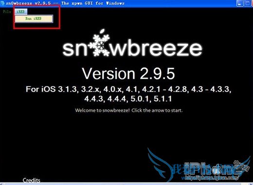 1.打开sn0wbreeze,点击左上角的“ireb”,选择“run ireb”,跳转到IREB引导界面。