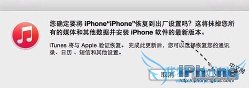9、接着iTunes会连接苹果的更新服务器,检测当前最新的iOS版本,并提示我们是否要删除手机上的所有数据并恢复,点击“恢复并更新”按钮继续。