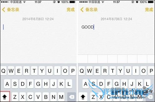 3、这时我们随便找一个设备来进行测试,笔者用的是备忘录,在备忘录中如果我们要连续输入大写字母,我们只需要连续按两下向上箭头,就可以实现大写字母锁定功能,连续输入大写字母了。