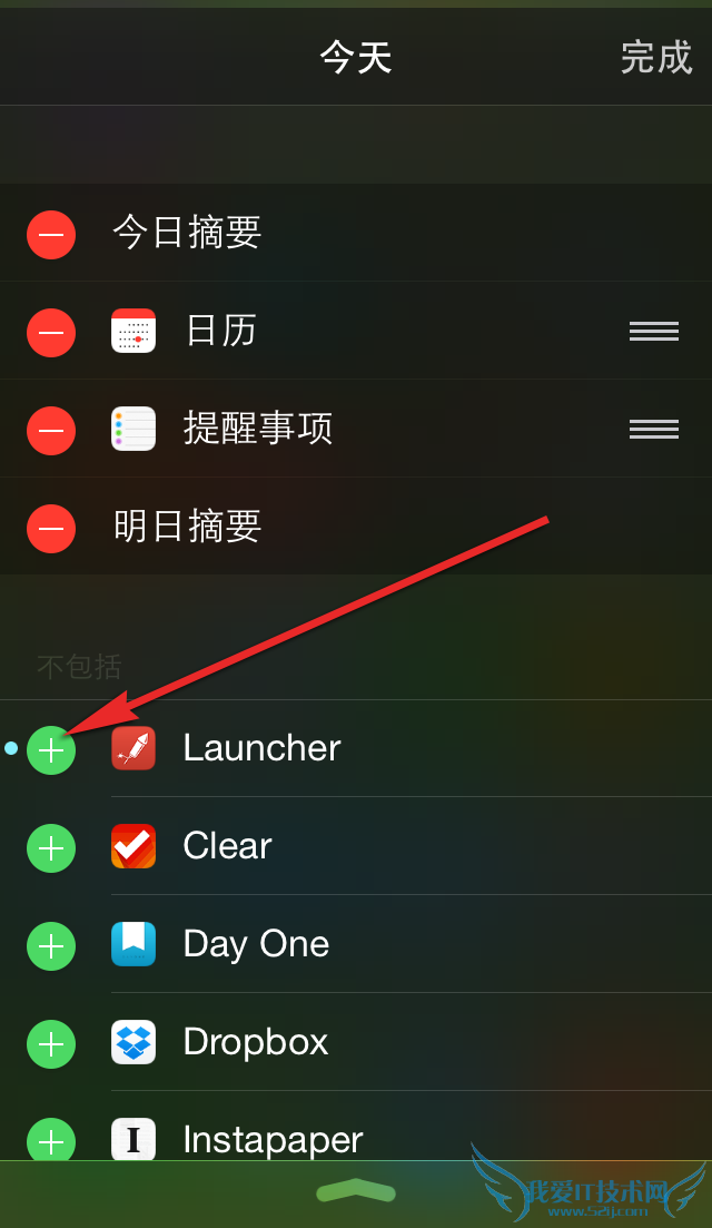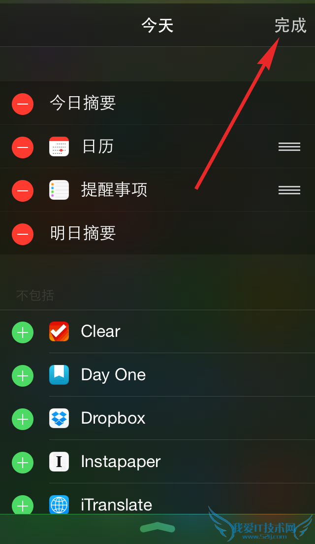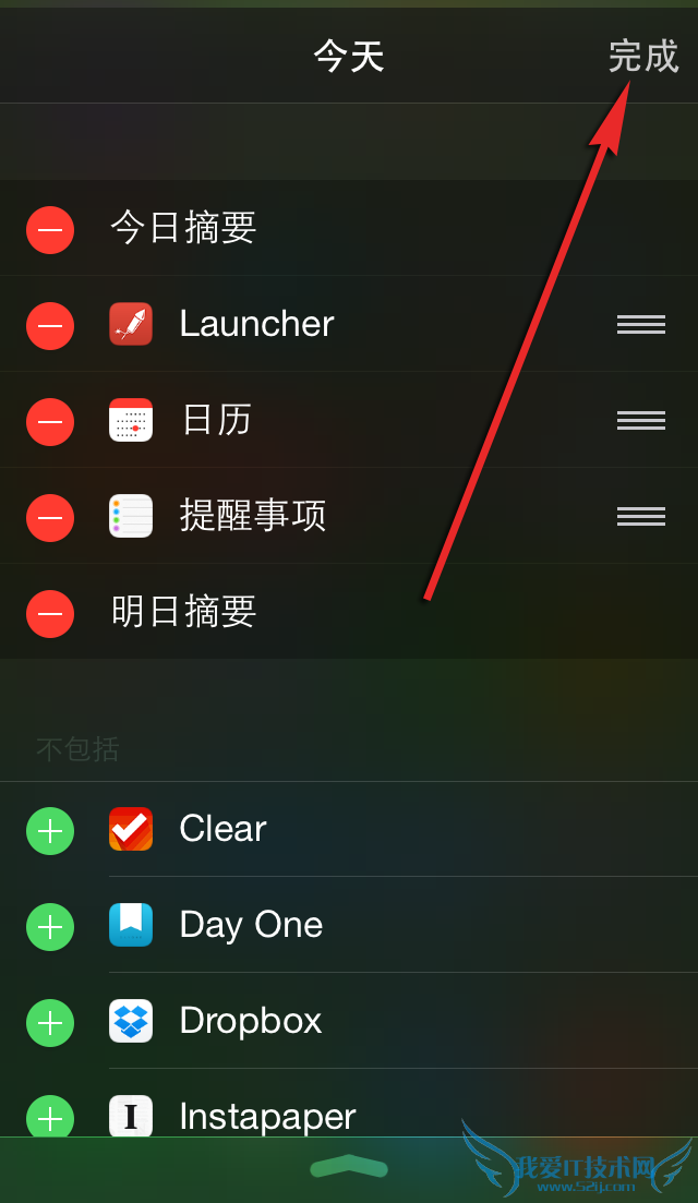 第五步: 你还可以拖动小部件来改变它们出现在通知中心的顺序,最后按右上角的「完成」按钮确定添加。
